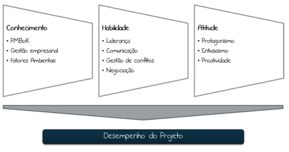 Compreender e aplicar conhecimento, ferramentas e técnicas que são reconhecidamente boas práticas não é suficiente para um gerenciamento de projetos efetivo. Na figura a seguir são demonstradas algumas das competências necessárias para um gerente de projetos utilizando o conceito do CHA (conhecimentos, habilidades e atitudes).