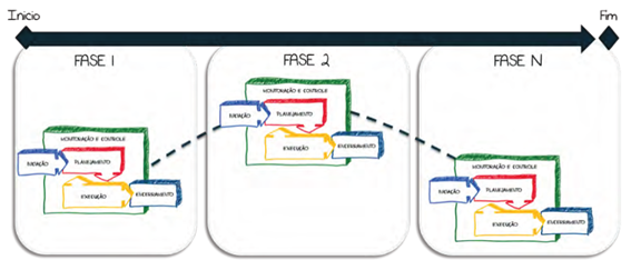 Em grandes projetos, divididos em fases, este mesmo processo pode ser repetido várias vezes. Por exemplo, em um projeto com uma fase de pesquisa, você conclui todas as etapas dessa fase, da iniciação até o encerramento, e, em seguida, executa o processo novamente para a fase de design.